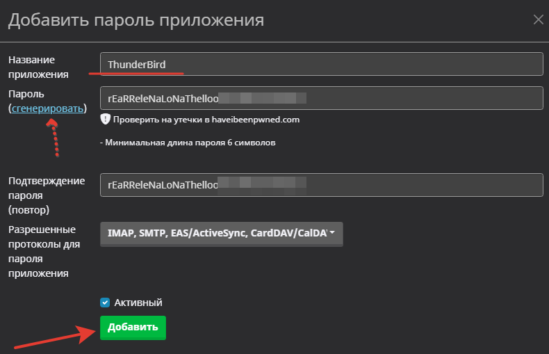 - Придумываем название, генерируем пароль (запоминаем/записываем) и нажимаем "Добавить":