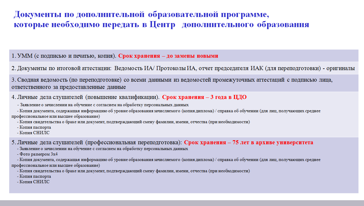Для оформления документов, подтверждающих успешное прохождение обучения (удостоверений о повышении квалификации или дипломов о профессиональной переподготовке), структурные подразделения ОБЯЗАТЕЛЬНО передают личные дела слушателей в Центр дополнительного образования.